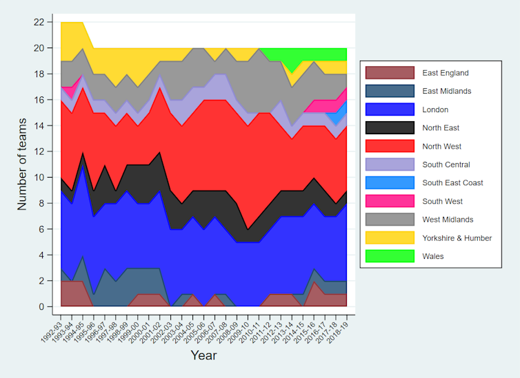 If you adjust this calculation for population size (assuming one club per approximately 2.5m people – distributing fairly 20 clubs across around 51m people), the north of England and London were – and still are – the only two regions punching above their weight. But you can also see a change over time as London has surpassed the north in terms of “over-representation” of clubs from the region. The north’s losses have benefited the south and Wales. Once again, drilling down into lower level regions, it becomes clear that the north-west is the only region comparable to London (Figure 3).